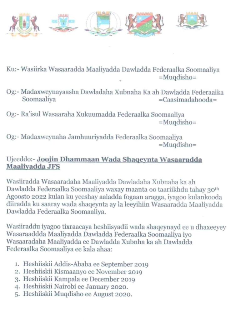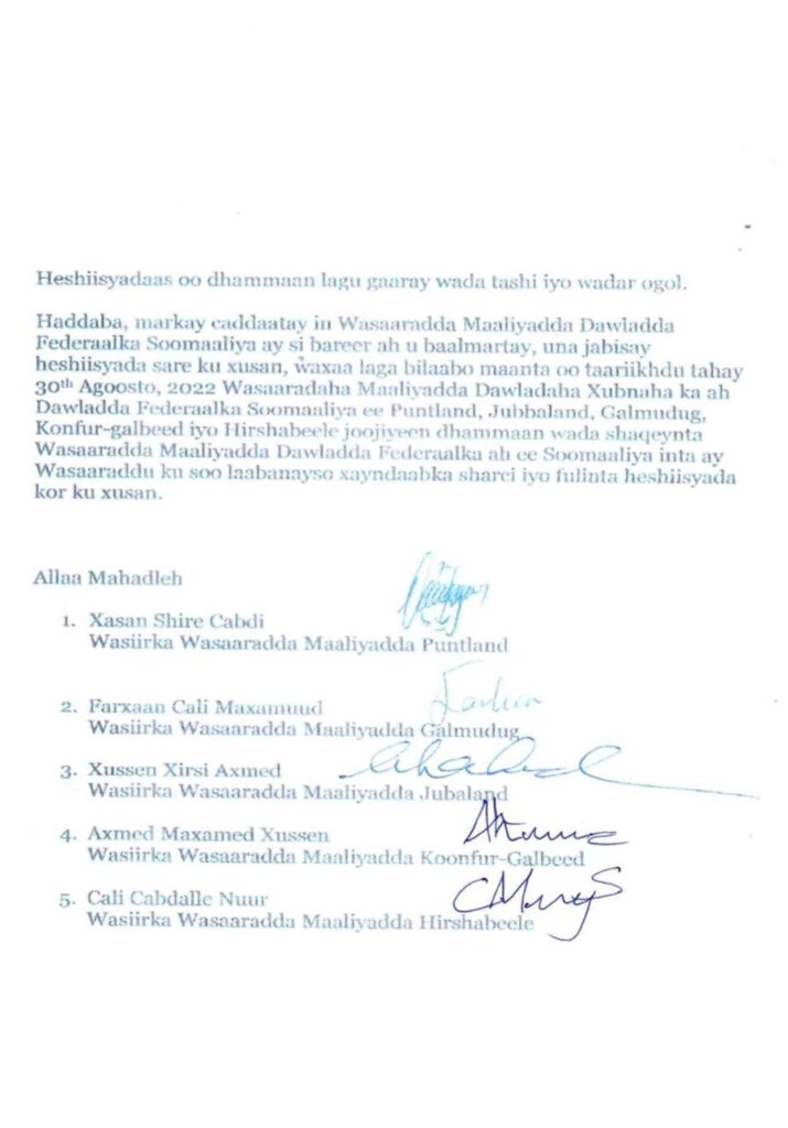 Wasaaradaha Maaliyadda dowlad goboleedyada Soomaaliya ayaa bayaan ay soo sareen kusheegay in ay joojiyay wada shaqayntii ay la lahaayeen Wasaaradda Maaliyadda Soomaaliya.
